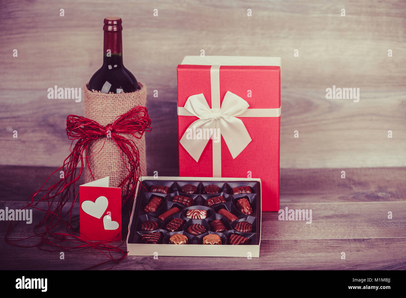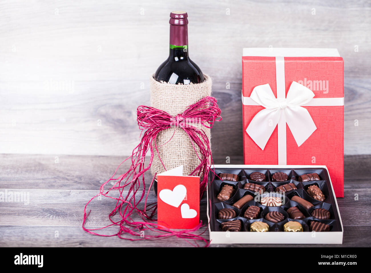 Botella De Vino Tinto Caja De Bombones Mensaje De Amor Por La Decoracion Y Regalo Con Corazon Rojo Sobre La Mesa De Madera Concepto De La Celebracion Del Dia De San Valentin