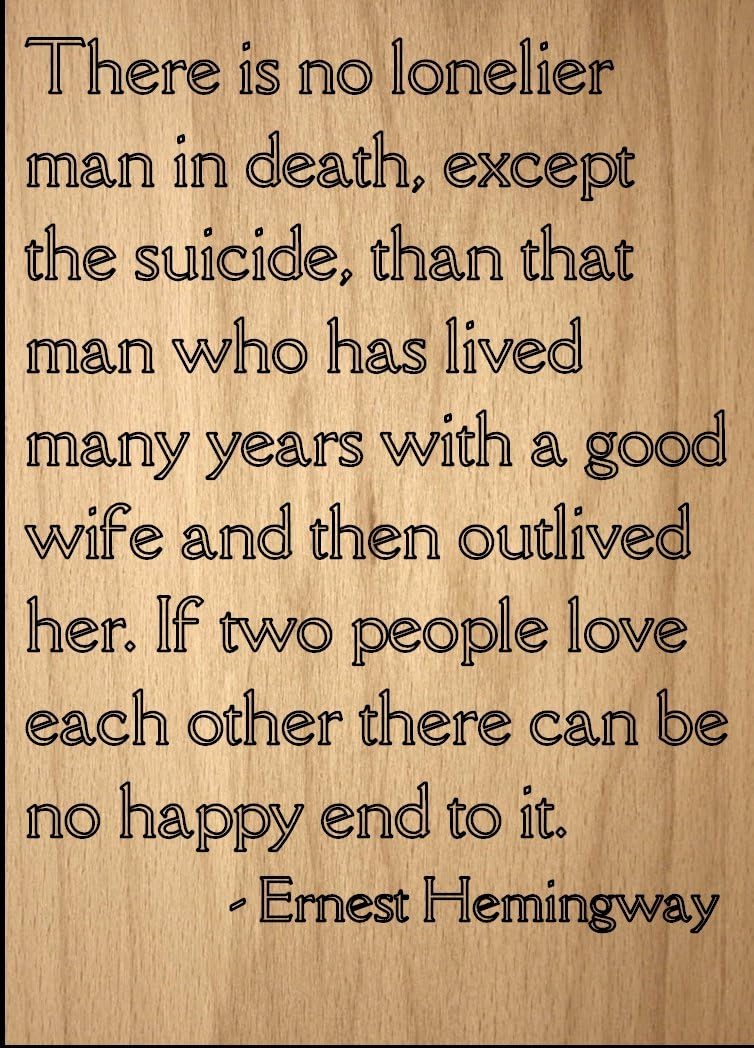Ernest Hemingway quotes from BrainyQuotecom "There is no lonelier man in death, except the suicide, than that man who has lived many years with a good wife and then outlived her If two people love each other there can be no happy end to it". Remarking on his concise but vivid prose, TIME noted in 1961 “Everything in Hemingway is seen as it might be looked at by a man on the day he knew he would die” True to his largerthanlife. In his 1932 nonfiction novel, Death in the Afternoon, about the ceremony and traditions of Spanish bullfighting, Hemingway described his cures as "reviving and refreshing;.