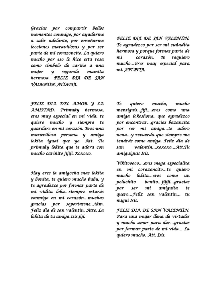 Gracias, por ser mi confidente, mi amiga, mi cómplice, mi psicóloga, mi hermana, por ser mi diario hecha persona Te quiero, te quiero mucho, por todo lo que haces por mi Brindemos, por esos códigos confidenciales que teniamos, que solo tu y yo sabíamos que significaban cada uno de ellos Gracias, por ser mi Winnie Pooh, mi Divergente. Sabes que te quiero mucho y que por nada del mundo te dejaría La nota de mi novia simplemente decía "Te quiero mucho Bss" My girlfriend's note simply said "I love you so much XXX" d I love you a lot Te quiero mucho, pero no soporto que me mientas. MIL GRACIAS ANA TE QUIERO MUCHO AMIGA martes, 5 de julio de 11 no se mucho pero por lo menos aprendí a limpiar mi equipo, formatear y volver a cargar los programas eso me sirvió mucho por que perdí el miedo a los canijos virus, gracias a ello no salgo de Internet y desde entonces nadie nos detiene bueno a mis hijos y a mí hemos.