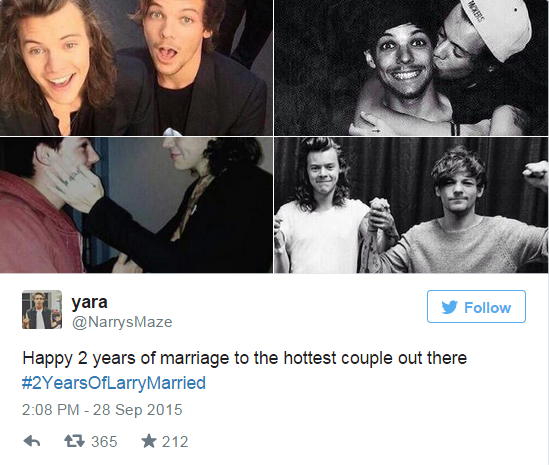 Harry Styles just completely shocked the whole world with a single tweet The singer has been giving his fans tons of surprises lately with his new music but his latest tweet woke up a fandom that was obsessed with his friendship with his One Direction bandmate Louis Tomlinson RELATED Here's What the Guys of One Direction Have to Say About Harry Styles' Single, "Sign of the Times". According to Larry shippers, Harry Styles, 21, and Louis Tomlinson, 23, have been a couple since the very beginning, but they only officially tied the knot on September 28, 13 Harry tweeted on. Fans are obviously celebrating the supposed anniversary see their tweets!.