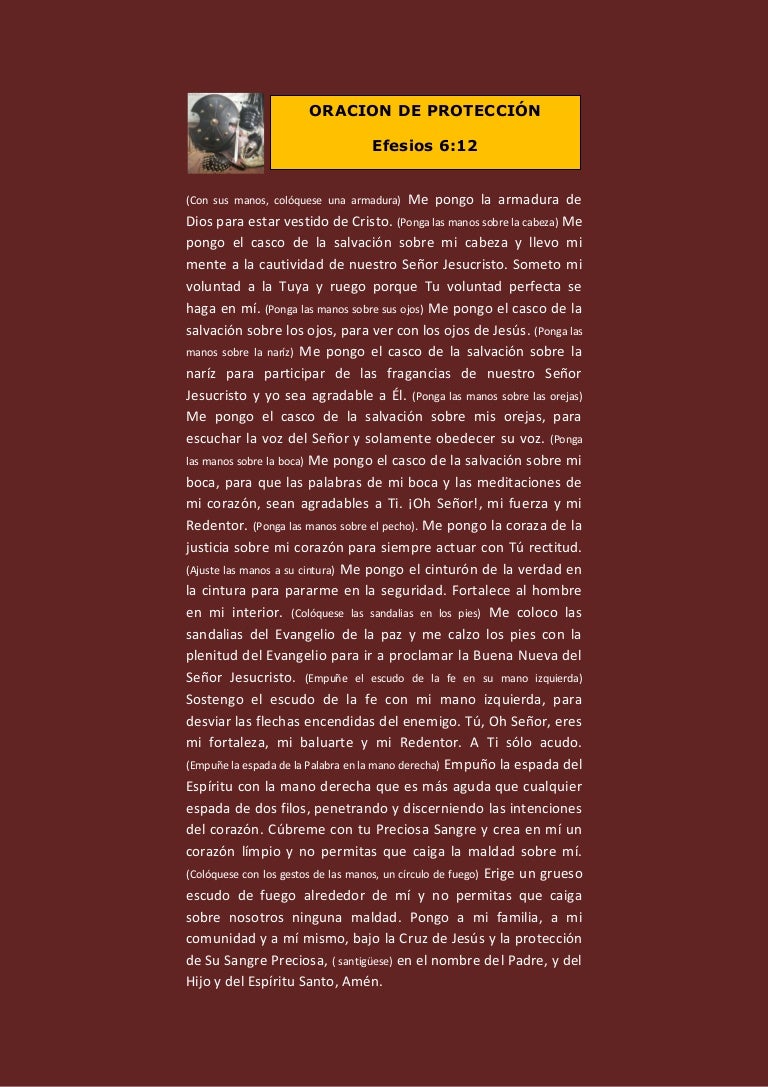 6 Hijos, obedeced. Orando en todo tiempo con toda oración y súplica en el Espíritu, y velando en ello con toda perseverancia y súplica por todos los santos.” Efesios 6:14-18. Poreso dice Efesios 6:11 vestíos de toda LA ARMADURA DE DIOS, para que podáis estar firmes contra las asechanzas del diablo.