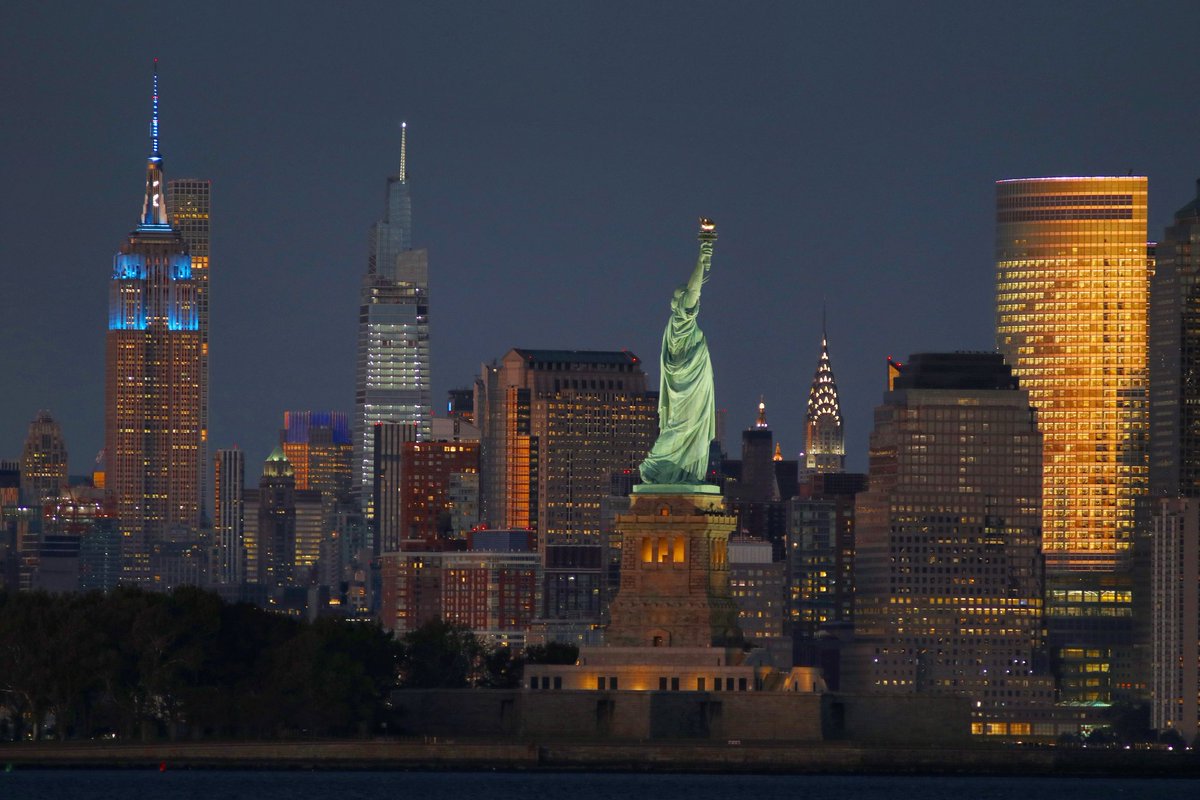 Gary Hershorn The Empire State Building Lit In Sky Blue To Celebrate John Lennon S 80th Birthday Tomorrow As The Sun Sets On The Statue Of Liberty And Chrysler Building Thursday