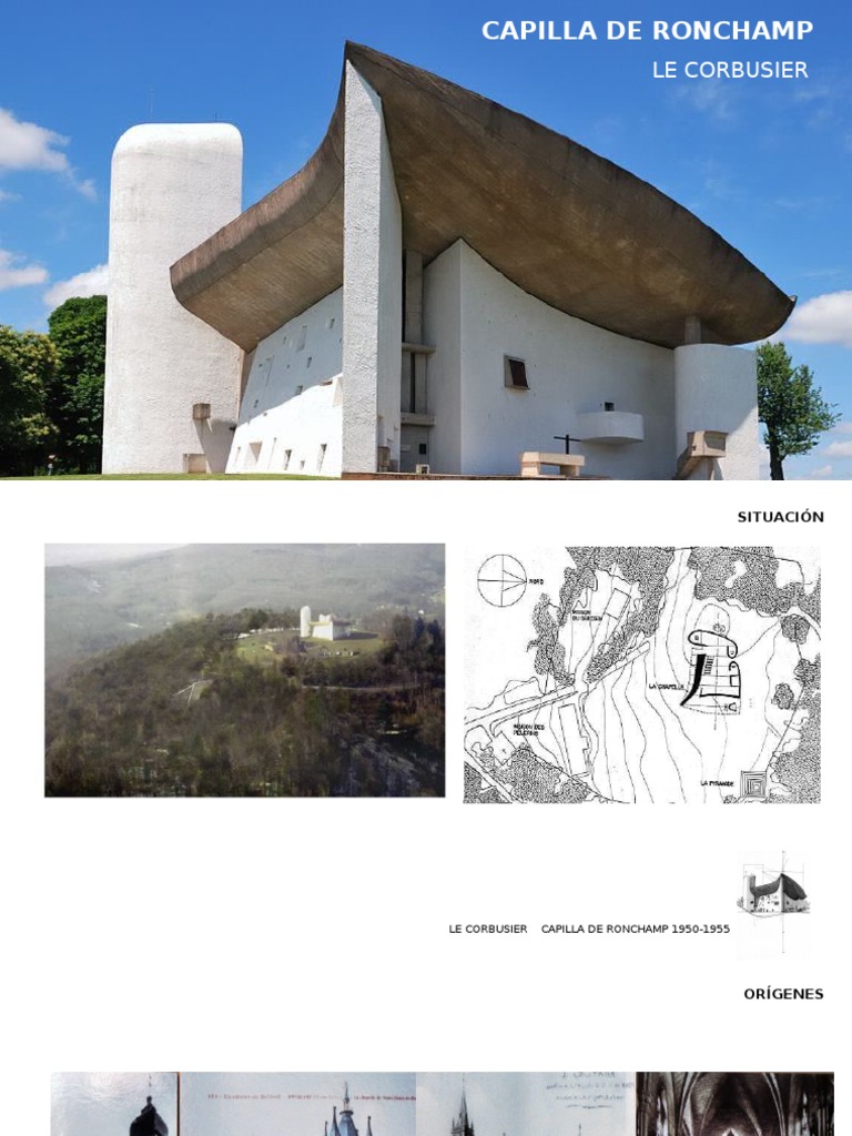 Uno de los lugares afectados por los bombardeos fue la capilla preexistente en lo alto de un cerro cercano a la localidad de Ronchamp, próxima a Belfort, un lugar que tradicionalmente se dedicó a la peregrinación y culto católicos Aunque conocido como uno de los máximos exponentes del racionalismo arquitectónico, Le Corbusier ensayó con modelos de la arquitectura orgánica, combinándola con el entorno siempre fiel a los principios del Movimiento Moderno, la pequeña capilla de. 1 Jaime Alberto Sarmiento, en su tesis doctoral “La Capilla de Ronchamp de Le Corbusier”, Barcelona, Universidad Politécnica de Cataluña 1997, menciona un texto de Mogens Krustup que remite la procedencia de las imágenes al capítulo 12 del libro del Apocalipsis 2 Le Corbusier, “Le poéme de l’angle droit” 1955. ' La Capilla de Notre Dame du Haut En la comuna de Ronchamp, al sureste de París, se encuentra uno de los proyectos más inusuales del arquitecto Le Corbusier, la Iglesia Notre Dame du Ronchamp, mejor conocida como RonchampEl encargo nace hacia 1950, cuando después de terminar la II Guerra Mundial, la iglesia de la comuna, había sido destruida.