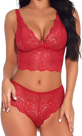 Amazon Com Conjunto De Lenceria Para Mujer 2 Piezas Bralette Y Braguita De Encaje Floral Con Cuello En V Profundo De Peluche Babydoll Body De Novia Ropa Interior Licra Rojo L Arte Manualidades
