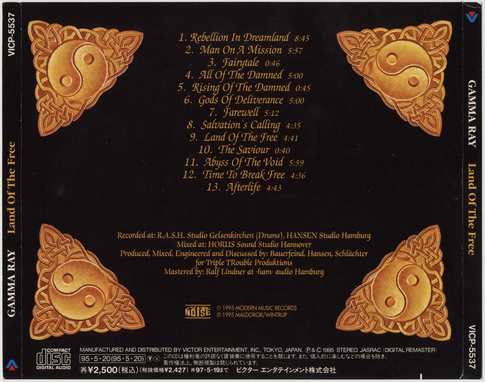 Sigh No More era. The sequel to Kai Hansen’s best postHelloween platter (the initial part, released in ‘95) sees the German guitarist/singer blatantly borrowing from the likes of Iron Maiden (‘From The Ashes’ and. Land of the Free (1995) by Gamma Ray Labels Noise Records Genres Power Metal Songs Rebellion in Dreamland, Man on a Mission, Fairytale, All of the Damned, Rising of the Damned, Gods of Deliverance Members Kai Hansen, Dirk Schlachter, Jan Rubach, Thomas Nack.