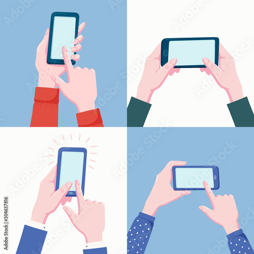 Set Of Pairs Of Human Hands Holding Mobile Phone Smartphone Cellphone With Blank Screen Tapping Screen With Finger Typing Flat Cartoon Vector Illustration Isolated On White Background Buy This Stock Vector