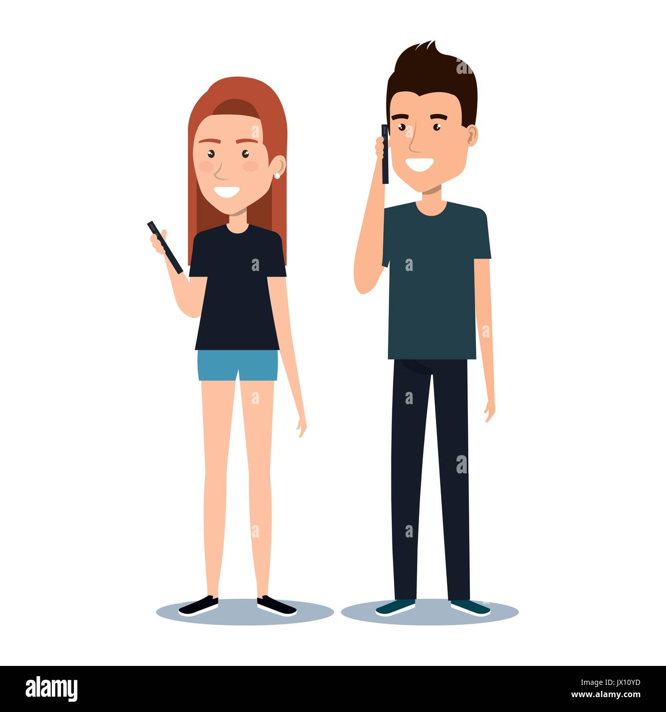 Young Man And Woman Holding Smartphone Using By Mobile Phone Cartoon Stock Vector Image Art Alamy