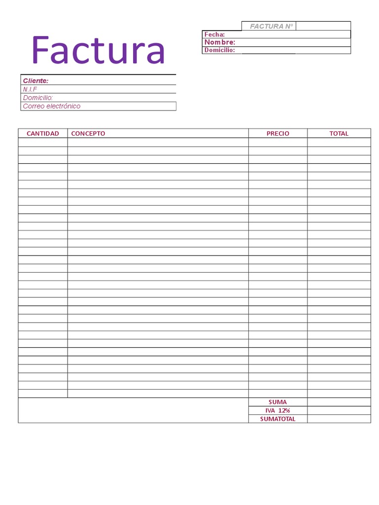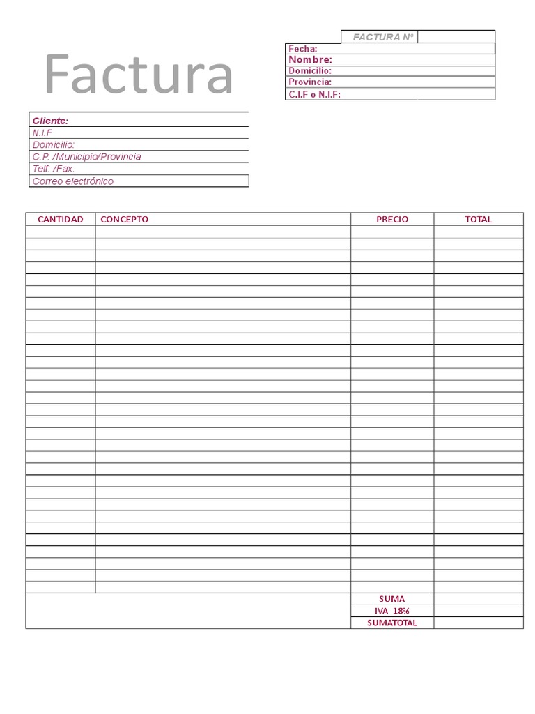 Plantillas de facturas en Word para descargar gratis 17/01/17 Tips y trucos En la página específica Modelo Factura encontrarás hasta cuatro modelos de facturas distintas, que podrás usar según sean tus necesidades Así pues, además descargar una factura básica,. Una factura es un documento legal que todo profesional, empresario o autónomo está obligado a emitir a la hora de realizar cualquier operación económicaEste documento debe reflejar toda la información necesaria sobre dicha operación El modelo que hemos plasmado aquí es de carácter general y puede ser modificado según lo requieran las circunstancias. Este tipo de plantillas de facturas de Excel para descargar gratis se utilizan para facturar servicios que llevan a cabo autónomos y profesionales Por ejemplo, impartir clases de inglés por.