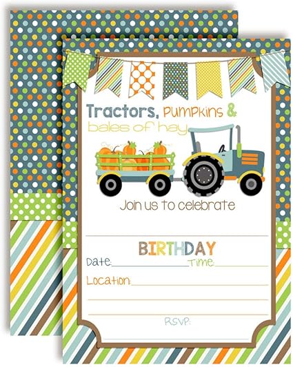 Amazon Com Amandacreation Invitaciones Para Fiestas De Cumpleanos De Ninos Con Diseno De Tractor De Caidas Con Calabazas Tarjetas De 5 0 X 7 0 In Con Sobres Blancos Toys Games