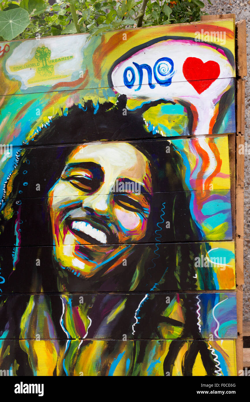 Bob Marley One Love Painting On Side Of Wooden Plant Container Stock Photo Alamy