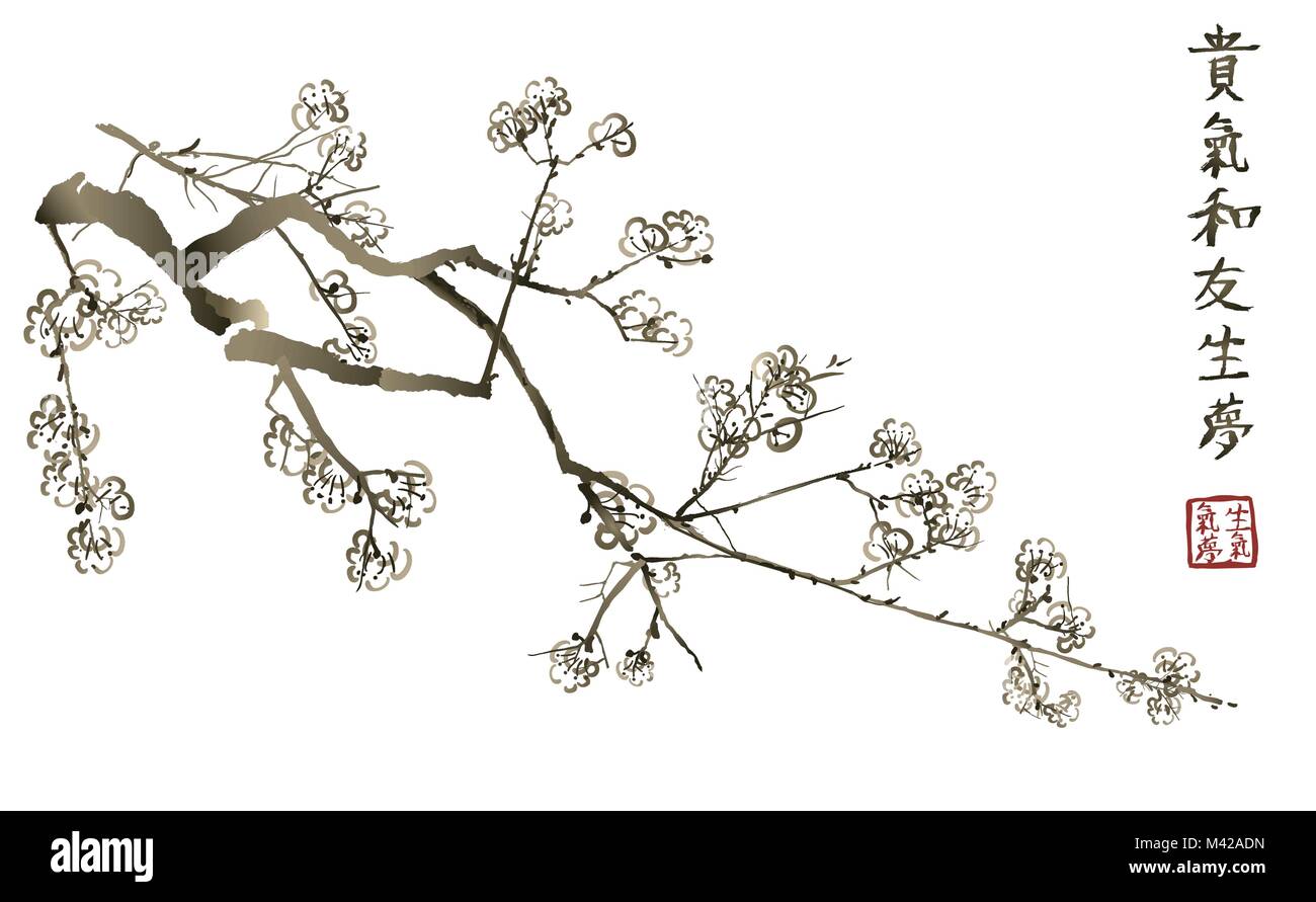 Rama De Florecimiento Sakura Cerezo Japones Ilustracion Vectorial Ideograma Ideograma Honor 1 2 Energia Ideograma Ideograma Armonia 3 4 Frie Imagen Vector De Stock Alamy