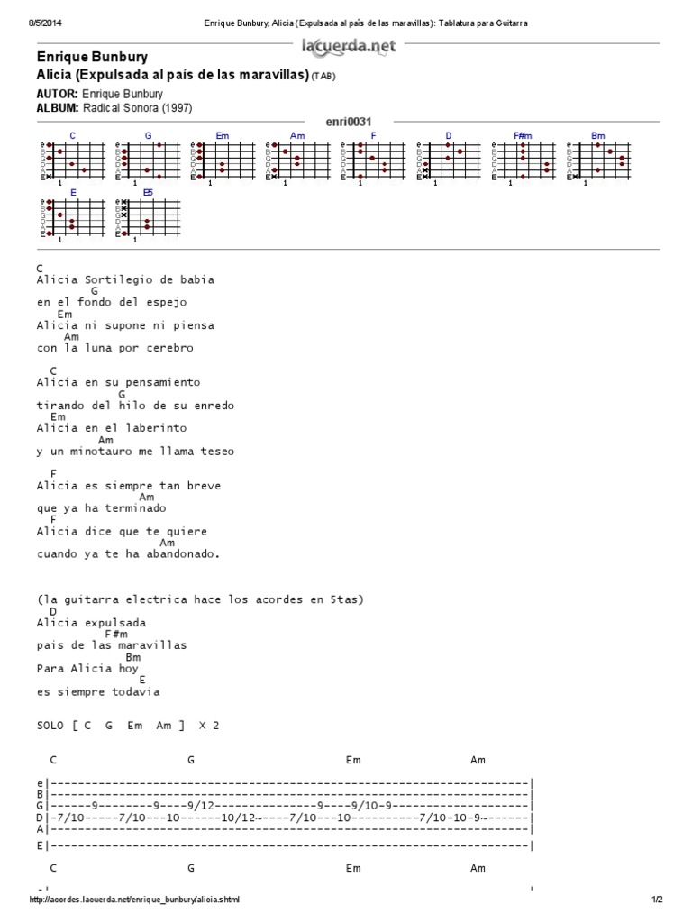 Alicia es siempre tan breve que ya ha terminado alicia dice que te quiere. Acordes de Enrique Bunbury Alicia (Expulsada al país de las maravillas) Versiones del Artista Historial Alicia (Expulsada al país de las maravillas) Enrique Bunbury Enrique Bunbury Radical Sonora 1997 F#m pais de las maravillas Bm Para Alicia hoy E es siempre todavia SOLO C G Em Am. Alicia expulsada Al país de las maravillas Para Alicia, hoy, Es siempre todavía Alicia, viajando entre lunas, De charla con musarañas Alicia, tejiendo las nubes, Con tela que nunca se acaba Alicia es siempre tan breve Que ya ha terminado Alicia dice que te quiere Cuando ya te ha abandonado Alicia expulsada al país de las maravillas.