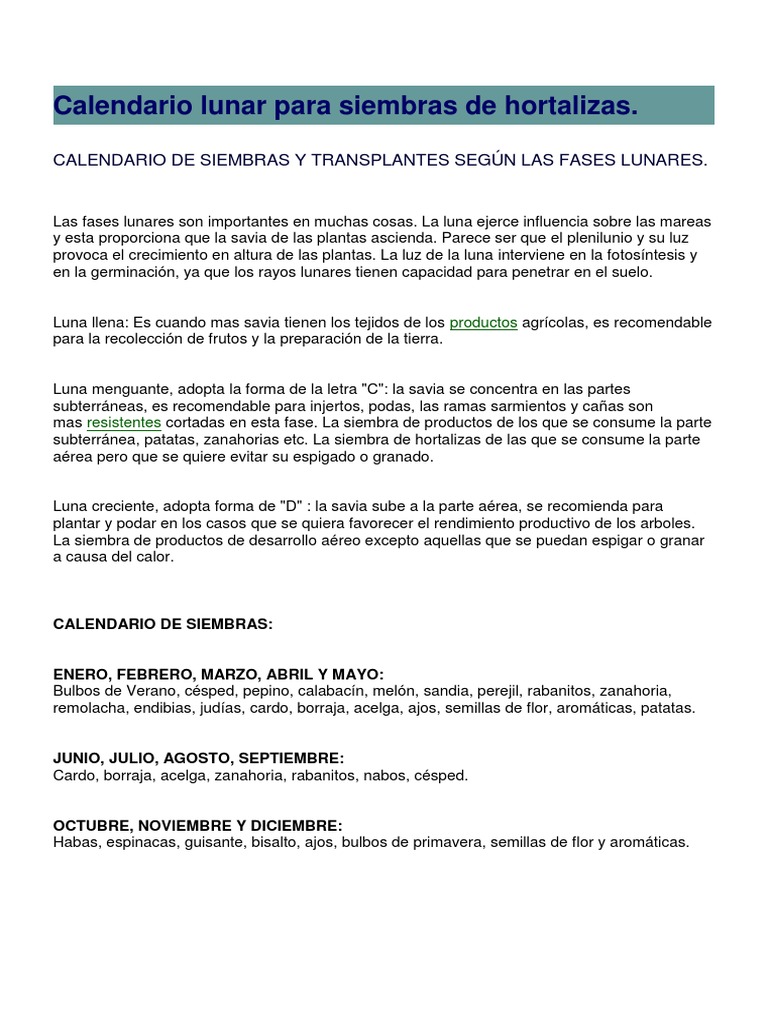 15oct17 Explora el tablero de Claudia Barra "CALENDARIO LUNAR DE LAS SIEMBRAS" en Ver más ideas sobre siembras, cultivo de hortalizas, huerta en macetas. Calendario lunar de cultivo La influencia de la Luna en la producción de las cosechas es un fenómeno que se viene observando desde tiempos inmemoriales Un año más, en THGrowcom te traemos el nuevo Calendario lunar 21Con él podrás conocer cuales son los mejores días para sembrar y plantar, hacer esquejes, cosechar, etc. Descubre cómo afecta la luna a tus plantas calendario lunar de siembra en 18 Más allá de las supersticiones, los rayos lunares poseen la capacidad de influir directamente sobre la misma tierra que da cobijo a las plantas, afectando a su vez a los niveles de savia.