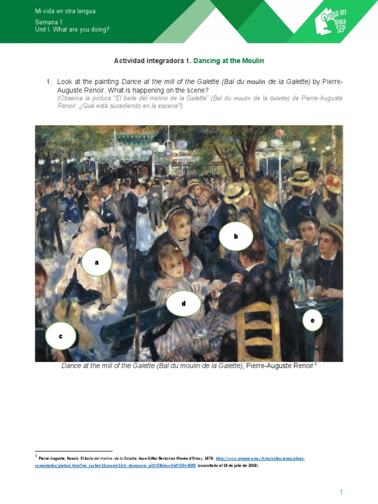 Bal du moulin de la Galette El baile del molino de la Galette Ésta es sin duda la obra más importante de Renoir a mediados de la década de 1870, fue presentada en la exposición del grupo impresionista de 1877 Aunque el pintor decidió representar a algunos de sus amigos, se esforzó ante todo por reflejar la atmósfera vehemente y alegre de este establecimiento popular de la Butte Montmartre. Mi vida en otra lengua Semana 1 Unit I What are you doing?. Santiago Rusiñol Interior del Moulin de la Galette 11 "En un articulo anterior decía que lo que más renombre ha dado al molino de la Galette, aparte de otras múltiples y variadas cualidades, es el famoso baile que, bajo su sombra y responsabilidad, se perpetra todos los domingos y demás días de Ia semana.