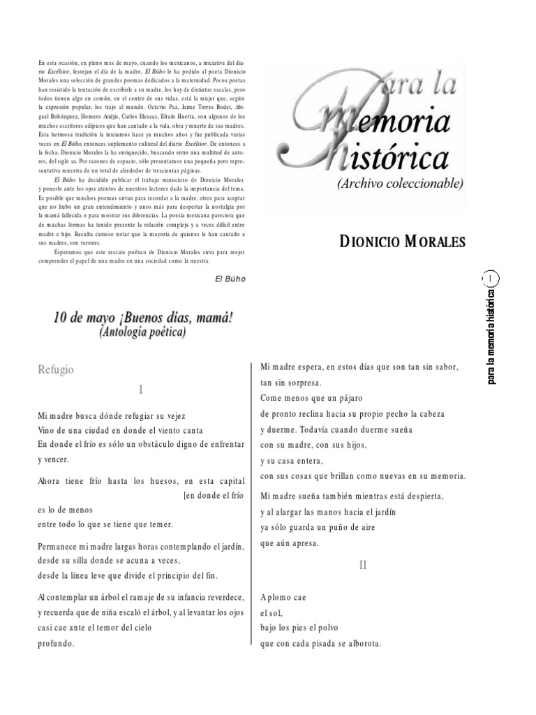 El poema es todo lo contrario, ya que habla de una pena de ausencia del ser amado. 44 Poemas a la madre POEMA A MI MADRE Hola, Esta carta debía haberla escrito hace dos años, así que por esta vez permitirme hablar en primera persona y os prometo que ya acabo Mamá, me encanta escribir a ordenador, aunque detesto todo lo que trae el Word 16 como predeterminado. Eras la boina gris y el corazón en calma En tus ojos peleaban las llamas del crepúsculo Y las hojas caían en el agua de tu alma Apegada a mis brazos como una enredadera las hojas recogían tu voz lenta y en calma Hoguera de estupor en que mi sed ardía Dulce jacinto azul torcido sobre mi alma Siento viajar tus ojos y es distante el otoño.