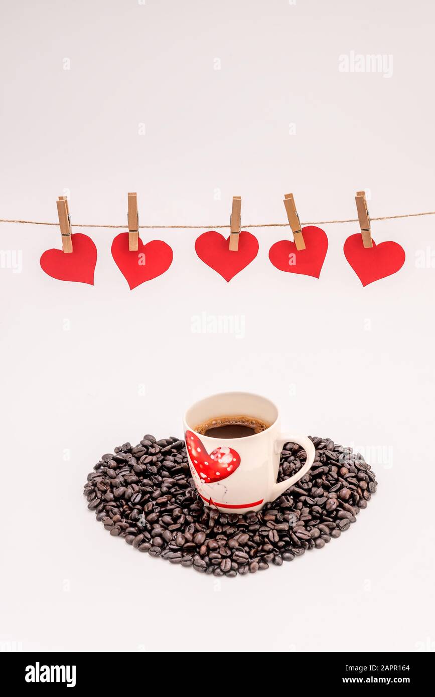 Cup Of Coffee With Heart Made Of Coffee Grains On White Background And Clothes Pegs And Red Paper Hearts On Rope Above Valentines Day Concept Stock Photo Alamy