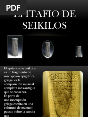 COMENTARIO DEL EPITAFIO DE SEIKILOSPer Hermi Cervera Tomàs Dolçaina PRESENTACIÓN OBRA * El Epitafio de Seikilos es uno de los fragmentos musicales con notación, más antiguos, encontrados en el mundo, que un tal Seikilos hizo plasmar sobre una columna de mármol, que fué colocada sobre la tumba de su mujer Euterpe La columna esta datada entre el siglo I y II antes de Cristo y fue. 2 Ver respuestas parte de una inscripción griega escrita en una columna de mármol puesta sobre la tumba que había hecho construir Sícilo para su esposa Euterpe, cerca de Trales (en Asia Menor), actual ciudad de Aydın, a unos 30 km de la ciudad costera de Éfeso (en Turquía) y datada en el. El Epitafio de Sícilo (en griego Ἐπιτάφιος τοῦ Σεικίλου) es la más antigua melodía escrita que se conoceEs parte de una inscripción griega escrita en una columna de mármol puesta sobre la tumba que había hecho construir un tal Sícilo para su esposa Euterpe, cerca de Trales (en Asia Menor), actual ciudad de Aydın, a unos 30 km de la ciudad costera de Éfeso (en.