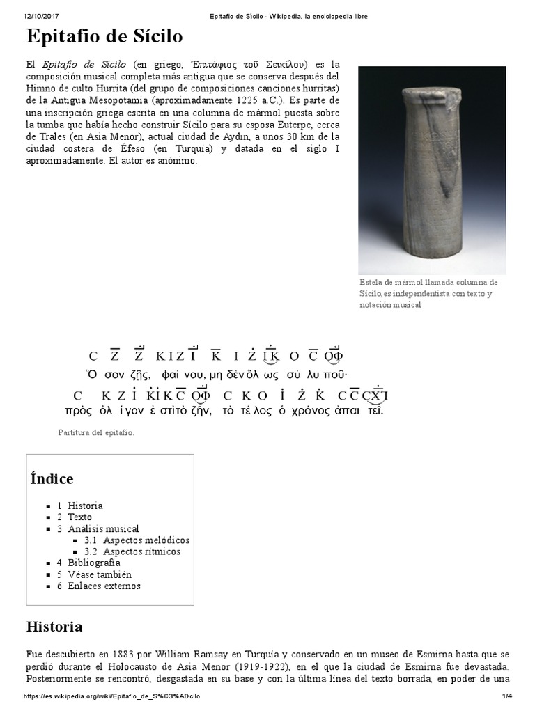 2 Ver respuestas parte de una inscripción griega escrita en una columna de mármol puesta sobre la tumba que había hecho construir Sícilo para su esposa Euterpe, cerca de Trales (en Asia Menor), actual ciudad de Aydın, a unos 30 km de la ciudad costera de Éfeso (en Turquía) y datada en el. El Epitafio de Sícilo (en griego Ἐπιτάφιος τοῦ Σεικίλου) está considerado como la composición musical completa más antigua que se conserva Forma parte de la inscripción en una columna de mármol para la tumba de una tal Euterpe, mandada hacer por su esposo Sícilo cerca de Trales (en Asia Menor) –actual ciudad de Aydın, a unos 30 km de Éfeso (en Turquía)–, y datada en el siglo I aproximadamente. El epitafio de Seikilos Aprovecha la vida, no la malgastes, disfrútala, brilla, pues es fugaz y el tiempo pasa rápido Tal vez Euterpe era joven cuando le sorprendió la muerte, pues solo a la pérdida prematura de los seres amados siguen lamentos sobre la brevedad de la vida y la banalidad de los pesares Siguiendo la costumbre, su cuerpo.