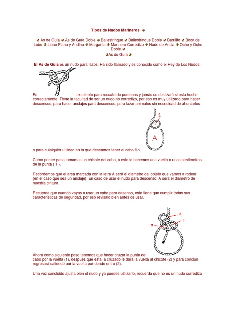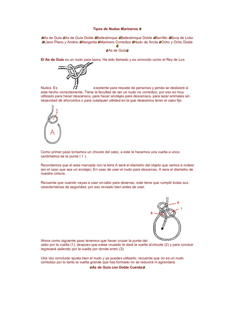 Cómo hacer 10 nudos marineros paso a paso 1 Nudo de rizo o nudo llano (Dificultad Baja) El nudo de rizo es también conocido como nudo llano o nudo cuadrado Está 2 Nudo de as de guía (Dificultad Baja) El nudo de as de guía consiste en un nudo básico que soporta una gran tensión 3 Nudo de. Aprende a hacer los nudos marineros más importantes a través de vídeo tutoriales que explican paso a paso cada nudo Nudo ballestrinque, nudo as de guía. 18feb14 Explora el tablero de Montse Serrano Mocholi "nudos marineros" en Ver más ideas sobre nudo marinero, nudos, manualidades.