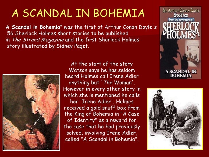 “A Scandal in Bohemia” is the first short story by Sir Arthur Conan Doyle featuring his now iconic character Sherlock Holmes It was published in 11 and is also well known for introducing the character of Irene Adler, a woman who becomes a romantic interest for Holmes in later works The story begins with a married Watson paying Holmes a visit. The scandal of this story is a past relationship that the king had with a woman named, Irene Adler There is a picture of them together and the king fears that it can ruin his marriage with the second daughter of the King of Scandinavia. A SCANDAL IN BOHEMIA I T o Sherlock Holmes she is always the woman I have seldom heard him mention her under any other name In his eyes she eclipses and predominates the whole of her sex It was not that he felt any emotion akin to love for Irene Adler.
