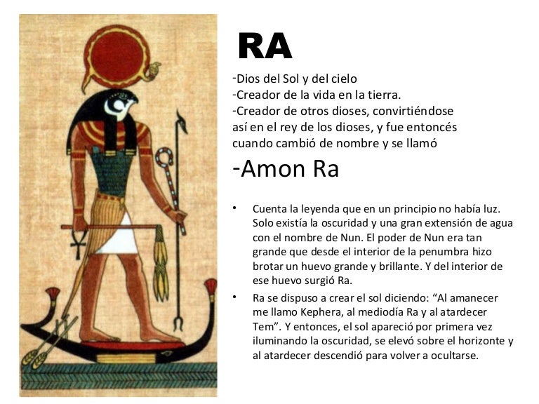 El diosSol Ra tiene muchos nombres, pero sólo uno es secreto el que le da gran parte de su poder Isis se preguntaba cómo podría obligar al dios del Sol a revelar su nombre más secreto Decidió esperar a que se le presentara una buena ocasión, y se puso a vigilarlo atentamente. El Antiguo Egipto fue una civilización cuyos ámbitos político, social, moral y económico estaban ligados fuertemente a la religión y a las diferentes divinidades que la encarnaban Entre ellas destaca el dios Ra o dios Sol Para la mitología egipcia Ra representaba al Dios del Cielo, Dios del Sol y origen de la vidaAdemás de ello, simbolizaba a la luz solar y exponente del ciclo de. Ra es el nombre de una de las deidades de mayor importancia en el panteón egipcio Fue considerado el dios sol, centro del culto solar que tuvo su máximo esplendor en la antigua ciudad de Heliópolis Este dios sol era el símbolo de la luz, origen de la vida, y en determinados momentos de la historia se lo asoció con el ciclo de la muerte y la resurrección.