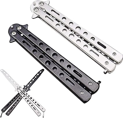 Textured silver paint over a black base The handles feature a skeletonized design to reduce weight This is a great priced butterfly knife made right here in the USA. Release the bite handle with your three fingers and swing it over the back of your hand With your dominant hand, clap your hands together Place your right thumb on the safe handle and the index finger on the back of the handle When you clap with force, the bite handle flips back Now, pinch with the index finger and thumb of your right hand and remove your other hand from the knife. Butterfly Knife, Trainer Practice Tool Steel Metal Folding Knife Unsharpened Butterfly Knife Comb for Practicing Flipping Tricks (Black and Silver, Set of 2) 37 out of 5 stars 299 $1149 $ 11 49.