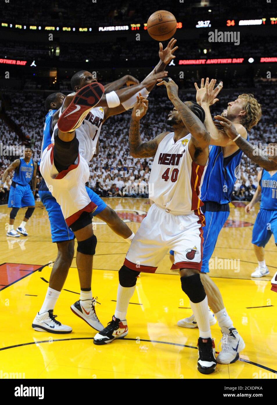 Miami Heat Forward Chris Bosh L And Heat Center Udonis Haslem C Struggle For A Rebound Against Dallas Mavericks Forward Dirk Nowitzki R In The First Half During Game 6 Of The