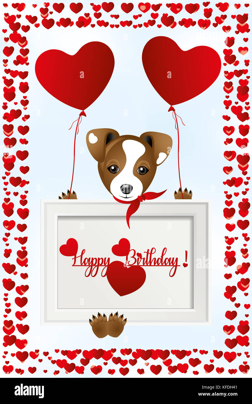 Lindo Perrito Jack Russell Con Globos De Corazon Y Palabras Feliz Cumpleanos Enmarcado Por Corazones Rojos Fotografia De Stock Alamy