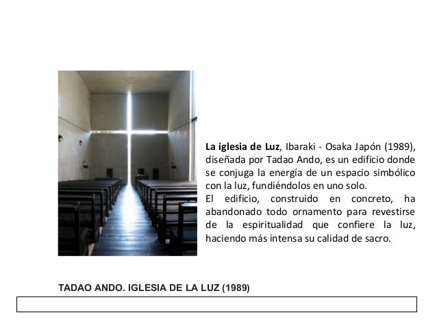 Dic19 Explora el tablero de Erick Moreno "Tadao Ando" en Ver más ideas sobre tadao ando, casa azuma, arquitectura. La iglesia de Luz, Ibaraki – Osaka Japón (19), diseñada por el arquitecto japonés Tadao Ando, es un edificio donde se conjuga la energía de un espacio simbólico con la luz, fundiéndolos en uno solo Este edificio es el reemplazo a una estructura de madera preexistente. Tadao Ando 13 de septiembre de 1941, Osaka Est considerado como el creador de la arquitectura del silencio Es muy respetado por su trabajo no paraleloen fiel heredera de las propuestas arquitectnicas clsicas hormign, sensible a la luz orientales natural, y un fuerte compromiso con la naturaleza Adquiri conocimientos de forma autodidacta Tadao Ando IGLESIA DE LA LUZ.