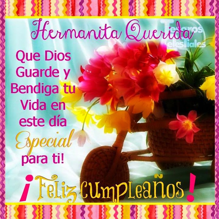 14ene19 Explora el tablero "feliz cumple hermana" de Dhl 54, que 1 personas siguen en Ver más ideas sobre tarjetas de feliz cumpleaños, felicitaciones de cumpleaños, feliz cumpleaños. ¡Feliz cumpleaños, querida hermana!. Happy Birthday mi amada hermana Hoy recuerdo tus enseñanzas, nuestros juegos de niños, incluso las peleas que tuvimos o la complicidad para tapar una travesura mutua Te deseo un.