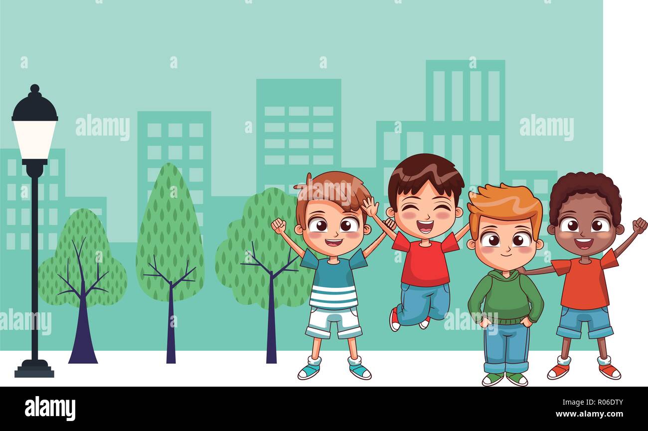 Feliz Amigos Ninos Jugando En Ciudad Paisaje Caricaturas Ilustracion Vectorial Diseno Grafico Imagen Vector De Stock Alamy