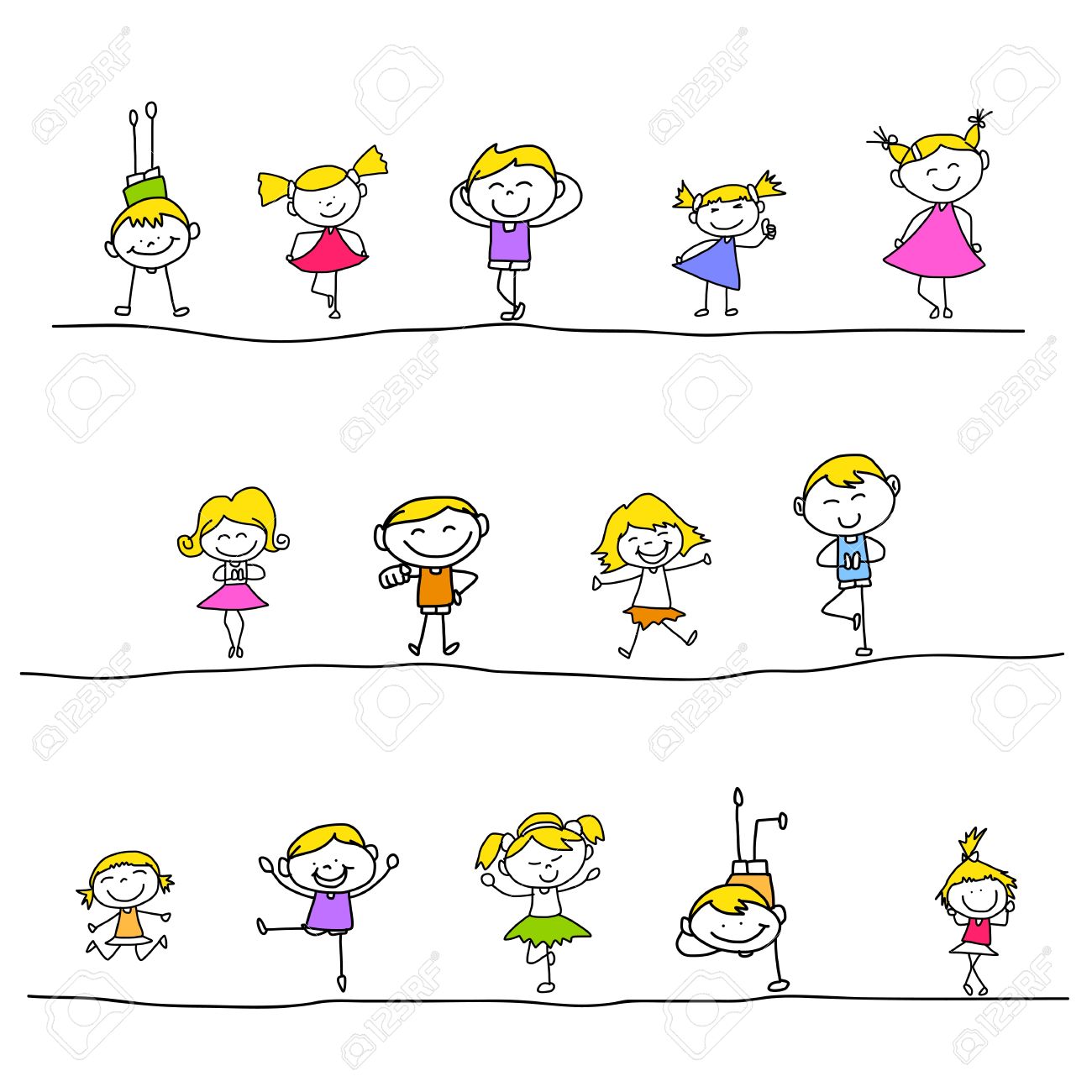 Conjunto De La Mano De Dibujo Caricatura De Ninos Felices Jugando Ilustraciones Vectoriales Clip Art Vectorizado Libre De Derechos Image