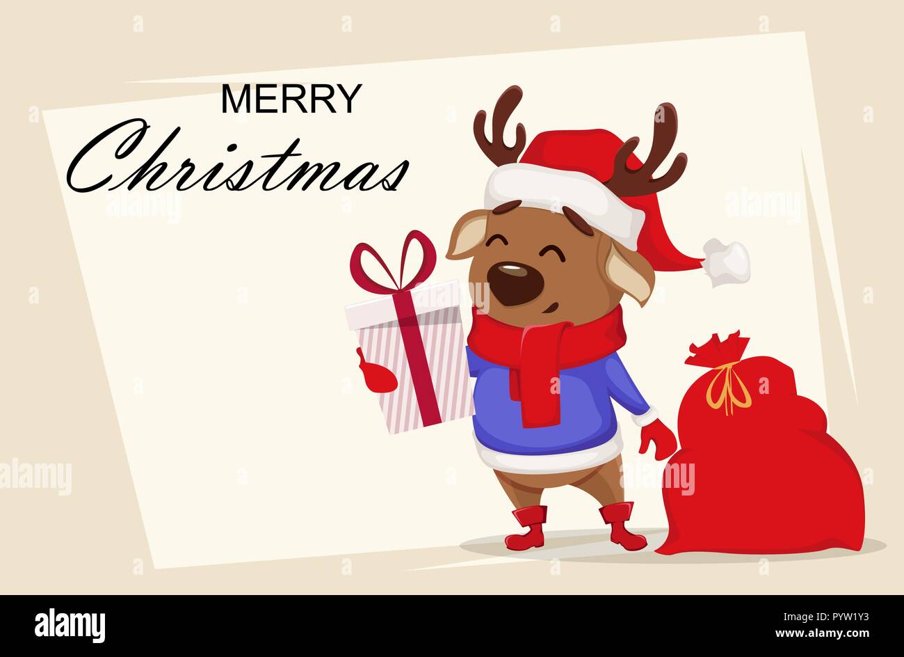Feliz Navidad Tarjeta De Felicitacion Con Cute Deer Vestidos De Santa Claus Sombrero Y Bufanda Personaje De Caricatura Divertida Alegre Celebracion Caja De Regalo Y De Pie Cerca De Ba Imagen Vector