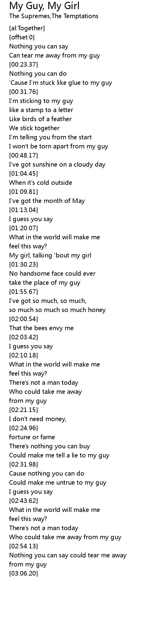 My girl temptations lyrics. The Temptations My Girl I've got sunshine on a cloudy day When it's cold outside, I've got the month of May I guess you'll say What can make me feel this way?. Lyrics of MY GIRL by The Temptations feat Eddie Kendricks (), Well I guess you'd say, What can make me feel this way?, My girl, My girl, My girl, Talkin'. The Temptations lyrics Find all lyrics for songs such as Papa Was A Rolling Stone, The Way You Do The Things You Do, at LyricsFreakcom My Girl Lyrics My Love Is True (Truly For You) Lyrics Neither One Of Us (Wants To Be The First To Say Goodbye) Lyrics Never, Never Gonna Give Ya Up Lyrics.