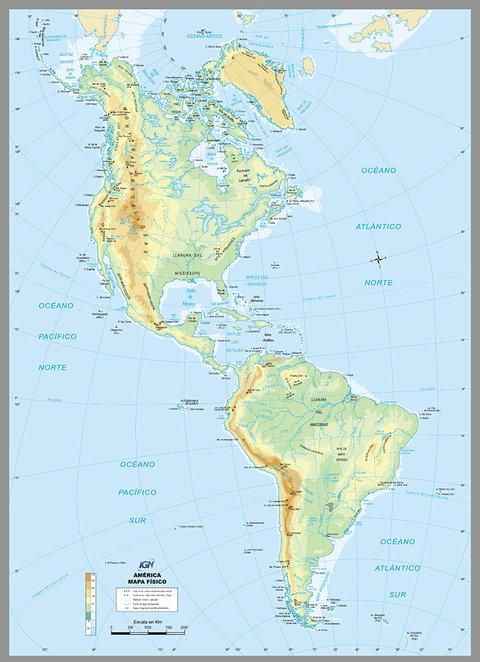 Montañas Rocosas (Rocky Mountains o, de manera popular “Rockies”) Una cadena montañosa que se extiende por el territorio de Canadá y de Estados Unidos, paralelo a la costa occidental del continente, desde Colombia Británica en Canadá hasta Nuevo México en USALa cima más alta es el monte Elbert en el estado de Colorado, 4401 mLa sierra tienen importantes yacimientos de minerales. Mapa Físico de América Central América Central es el istmo que se estrecha en el sur de América del Norte, con características geográficas únicas y variadas El Océano Pacífico se encuentra al suroeste, el Mar Caribe se encuentra al noreste y el Golfo de México se encuentra al norte Algunos fisiógrafos definen el istmo de Tehuantepec como la frontera geográfica del norte de. Brasil al noreste, Uruguay y el Océano Atlántico Sur al este;.