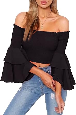 Arjungo Women S Vintage Off The Shoulder Tops Long Flared Sleeve Elastic Crop Tops Blouse Shirt At Amazon Women S Clothing Store