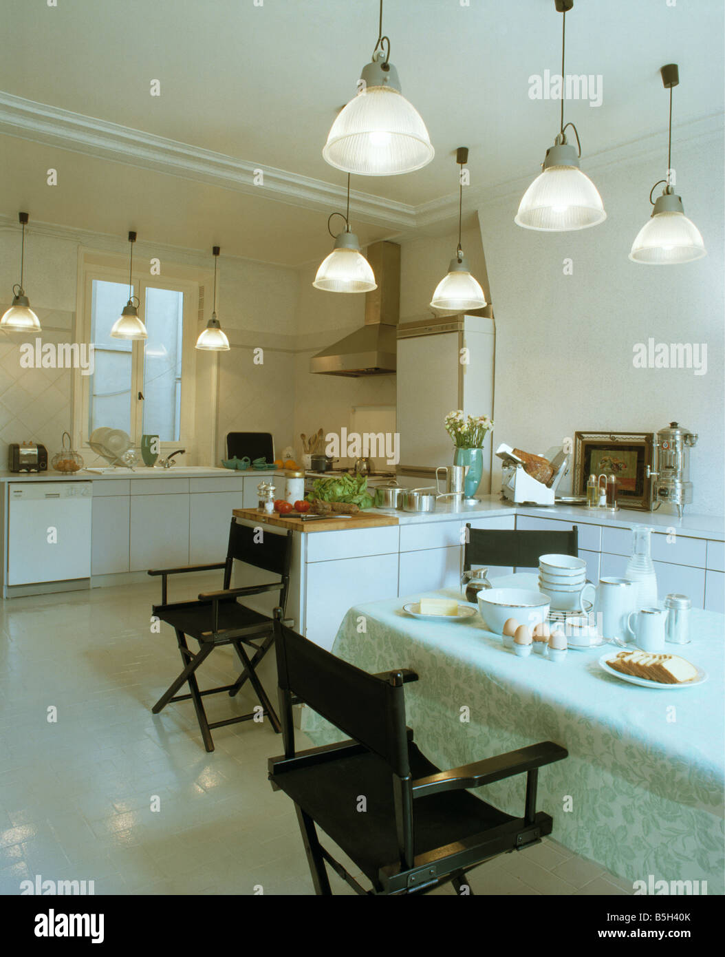Las Lamparas Colgantes De Cristal En La Moderna Cocina Comedor Con Vajilla Blanca Sobre La Mesa Con Un Pano Blanco Fotografia De Stock Alamy