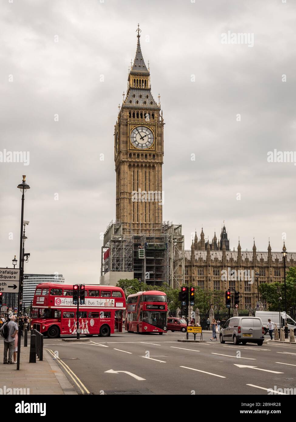Big Ben Under Scaffold Street View Of The Iconic London Landmark Under Renovation As Red Buses Pass In The Foreground Stock Photo Alamy