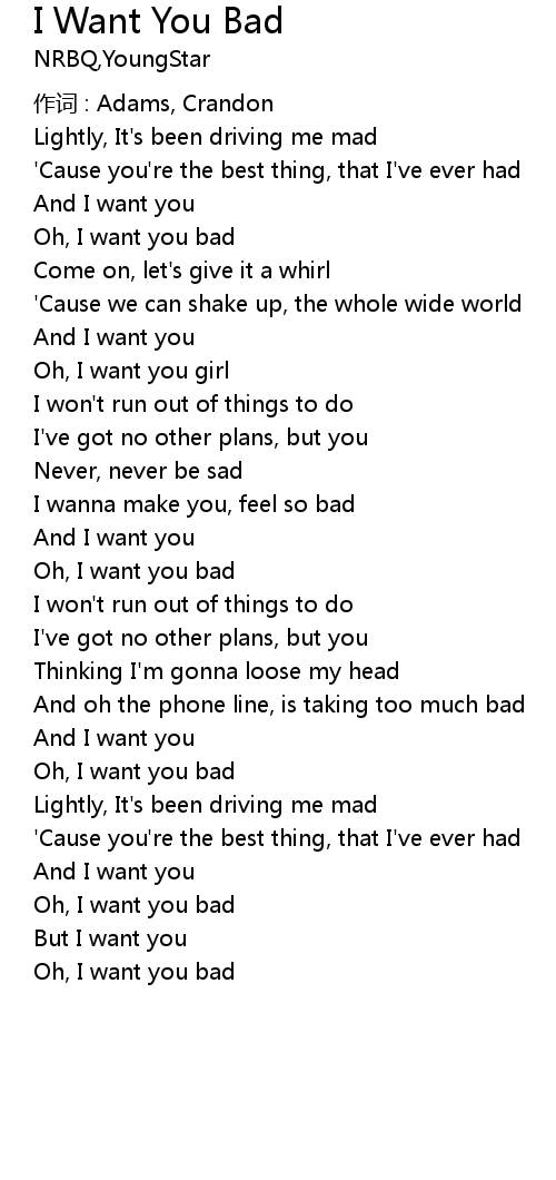 I Want You Bad Lyrics I want you so bad but I can’t have you / Can you come back so I can redo / The things I’ve messed up I’m sorry / Can we just back up restart things / I never thought. I want you, in a vinyl suit I want you bad Complicated, X rated I want you bad, bad, bad, bad, bad, bad Don't get me wrong I know you're only being good But that's what's wrong I guess I just misunderstood Go I want you, all tattooed I want you bad Complicated, X rated I want you bad, I mean it, I need it I want you bad, bad, bad, bad, bad, bad. I want you bad(I want you bad!) I want you, I want youI want you, I want youI want you, I want youI want you I might just go crazyCause you're my best friend's babyBut you got me thinking maybe, just maybeI don't know what to do I'm in love with someone else's girl, youRock my worldBut you're the one that I can't haveGirl, I want you bad In my.