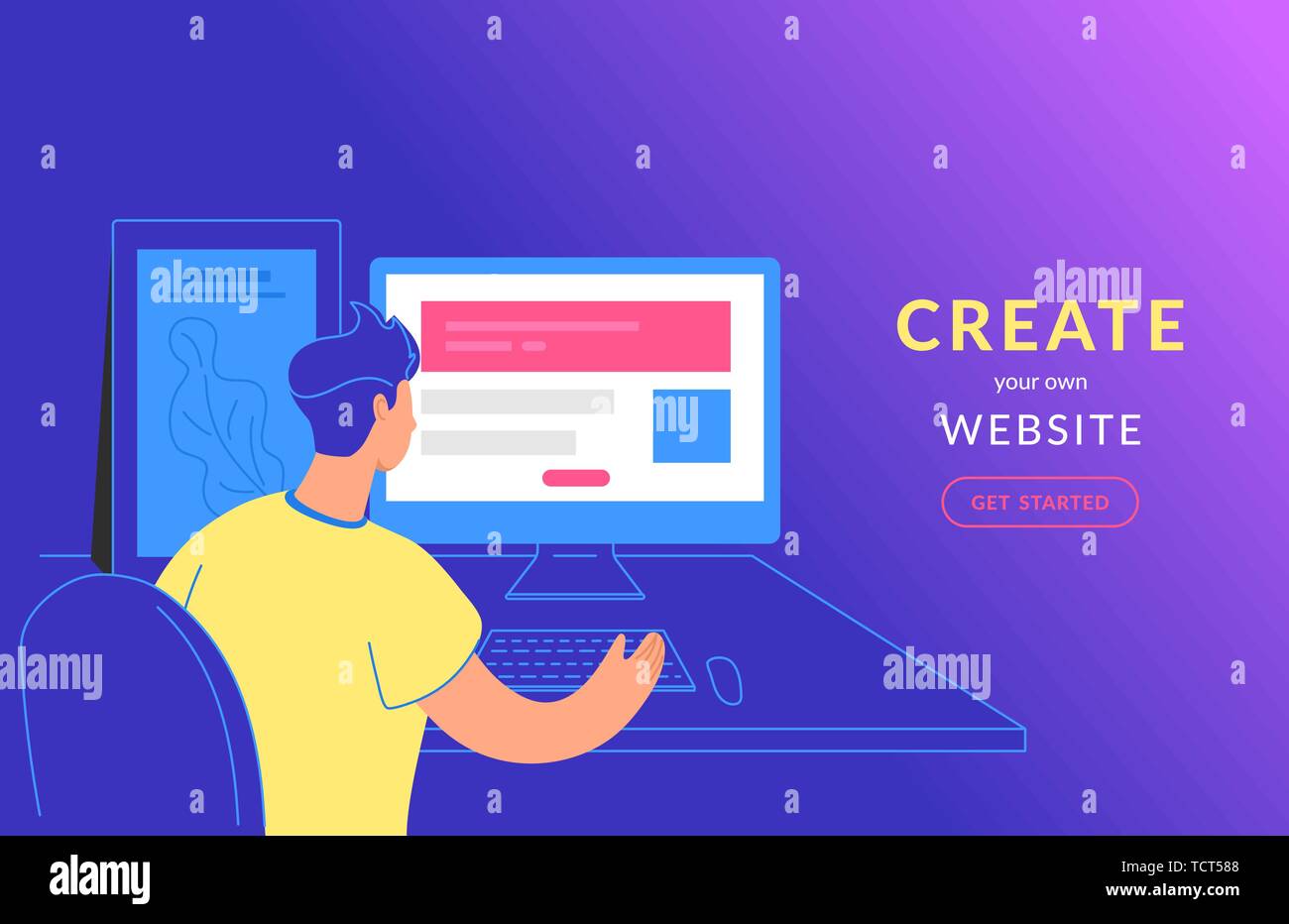 Crea Tu Propio Sitio Web Flat Ilustracion Vectorial De Joven Sentado Con Pc Y Crear Web Con Banner Utilizando Las Plantillas Web La Gente Usa Servise Imagen Vector De Stock Alamy