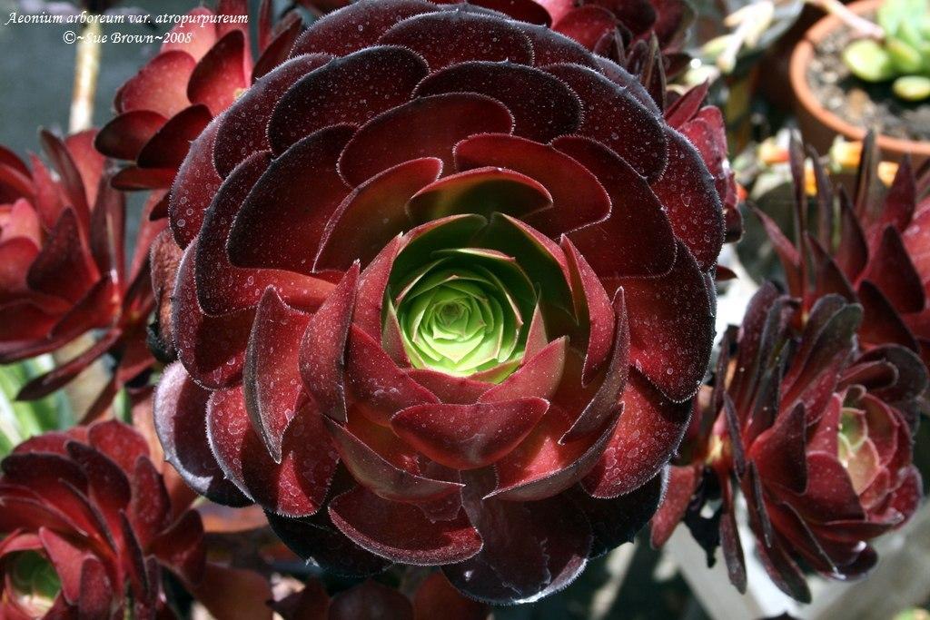 10 out of 5 stars 1 When in growth water moderately and feed every two or three weeks with a balanced liquid feed If you live in a cold area, it is better to plant in an indoor environment You also have the option to optout of these cookies Aeoniums prefer a bright and sunny location Aeonium arboreum 'Atropurpureum' is an evergreen succulent with magnificent rosettes of glossy, fleshy. The black rose, Aeonium arboreum var atropurpureum f nigrum cv Schwarzkopf (Zwartkop), is a branching succulent shrub that produces magnificent, shiny blackpurple, leaf rosettes at the ends of its branches It reacts to sunlight, and the stronger the sunlight, the blacker it becomes It really is quite extraordinary. Aeonium arboreum var atropurpurea y Aeonium arboreum 'Schwarzkopf ' son variedades con follaje púrpura oscuro (el color se acentúa con el sol), que le dan un bello aspecto Luce bien en una maceta Sus necesidades de cultivo son análogas a las de la especie tipo.