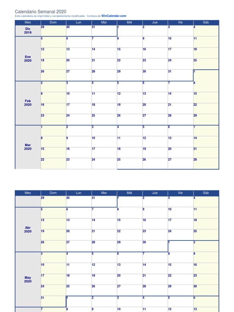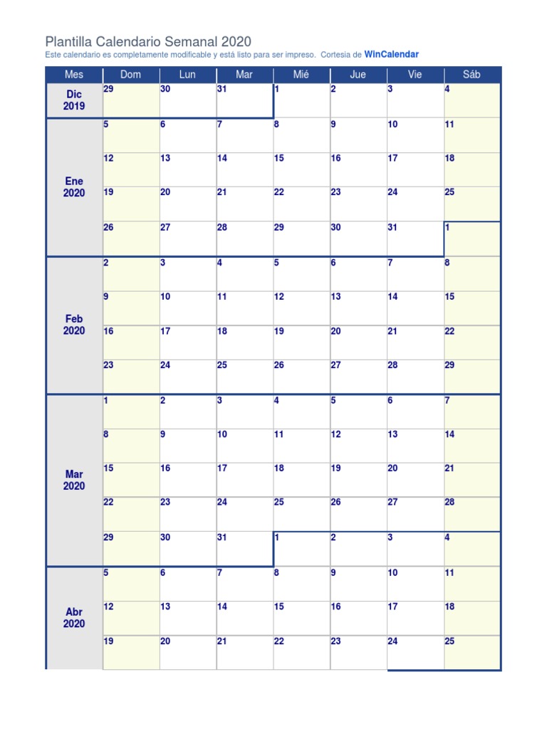 Calendario en Blanco Semanal 21 Cortesia de WinCalendarcom Este Calendario es completamente modificable e ideal para imprimir Más Calendarios de WinCalendar Calendarios Word Calendarios Excel Calendario Web. Descargar la plantilla de planificador semanal en Excel Si ya tienes claro que quieres utilizar esta plantilla de Excel editable, solo tienes que hacer clic en el botón de descarga para descargar la plantilla de Excel de planificador semanal Después, solo tienes que abrir el archivo que se descargará en tu dispositivo y empezar a editarlo. La plantilla de Excel de Calendario 19 es un calendario semanal donde el primer día de la semana es el domingo Características de la planilla Considera el domingo como día de inicio de la semana Pinta los feriados en el calendario de otro color (No apto para las versiones de Excel 9703 y 07) Marca los fines de semana.