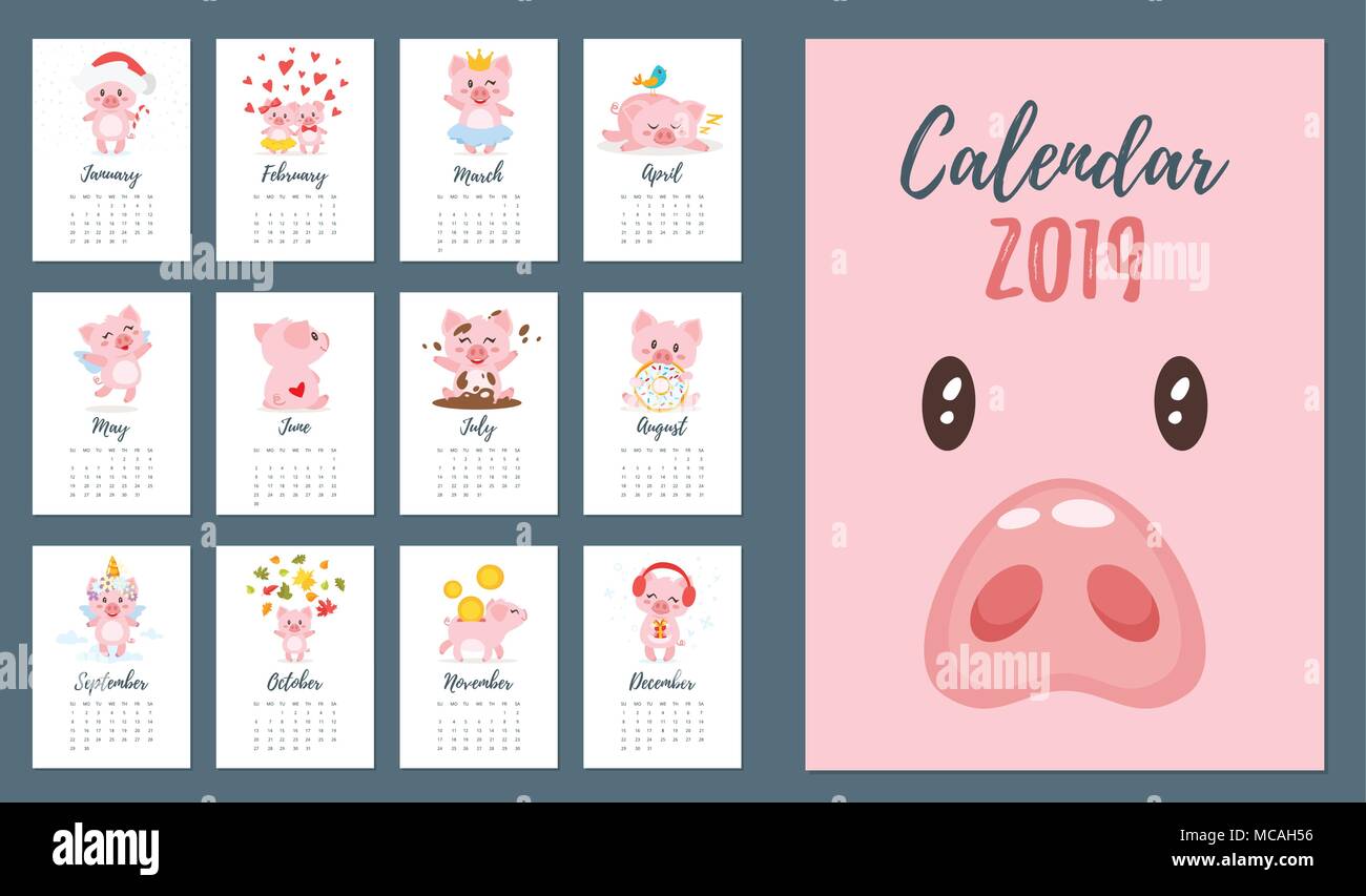 Vector Ilustracion Del Estilo De Dibujos Animados De 19 Cerdo Ano Calendario Mensual Plantilla Para Imprimir Piggy Diferentes Actividades Y Situaciones En Cada Pagina Imagen Vector De Stock Alamy