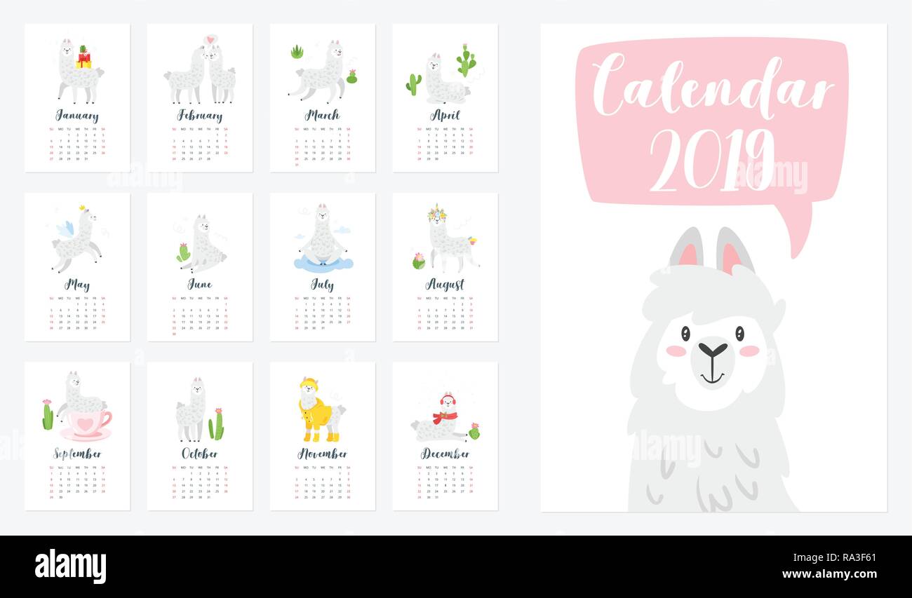19 Ano Calendario Mensual Con Lama Cartoon Plantilla Para Imprimir Alpaka Actividades Y Situaciones Diferentes En Cada Pagina Diseno Vertical Imagen Vector De Stock Alamy