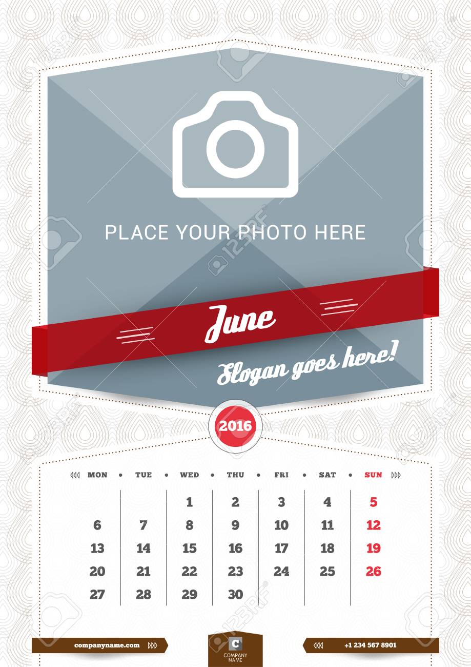 Junio De 16 Calendario Mensual De Pared Para El Ano 16 Vector Diseno Imprimir Plantilla Con Lugar Para Foto Y Fondo De Patron La Semana Comienza El Lunes Ilustraciones Vectoriales Clip Art