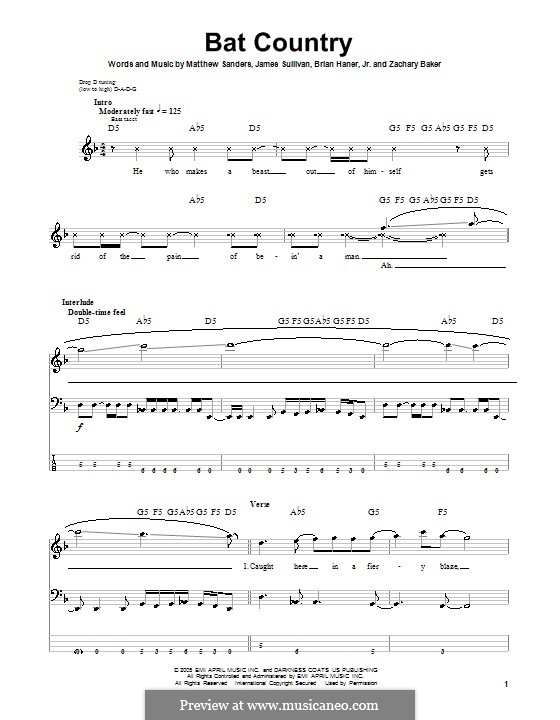 Bat Country guitar tab, as performed by Avenged Sevenfold Official, artistapproved notation the most accurate guitar tab on the web. Download original Guitar Pro tab BAT COUNTRY INTERACTIVE TAB (ver 5) by Avenged Sevenfold @ UltimateGuitarCom Learn & play tab for rhythm guitars, lead guitars, bass and percussion with free online tab player, speed control and loop. Bat Country Avenged Sevenfold Tabbed by travis Email syn_gates_punk14@msncom *This is the official tab for Bat Country The solo is not included in this tab, but check out the other tab I put up on this site labeled "Bat Country," where it is only the complete solo tab Tuning Distorted Guitars= D A D G B E (low to high) Guitars 1 and 2 Acoustic Guitars= E A D G B E (low to high) Guitars 3 and 4 Electric Guitars= E A D G B E (low to high) Guitars 5 and 6 Clean.