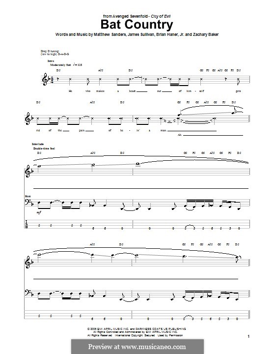 High quality sheet music for "Bat Country" by Avenged Sevenfold to download in PDF and print Arranged for Guitar and Bass. Http//wwwguitartabsch/Avenged Sevenfold TabsBat Country (rhythm). Bat Country Bass Tab by Avenged Sevenfold with free online tab player One accurate version Recommended by The Wall Street Journal.