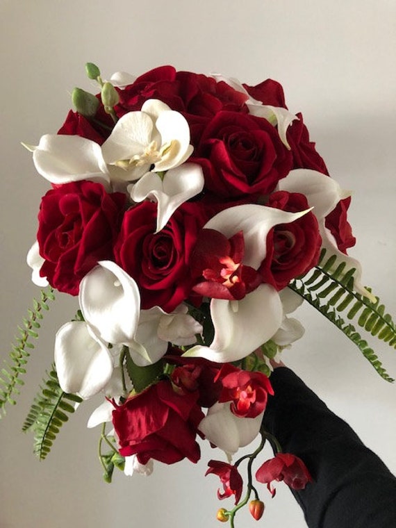 Blood Red Roses Calla Lillies Fern Orchids Red White Etsy
