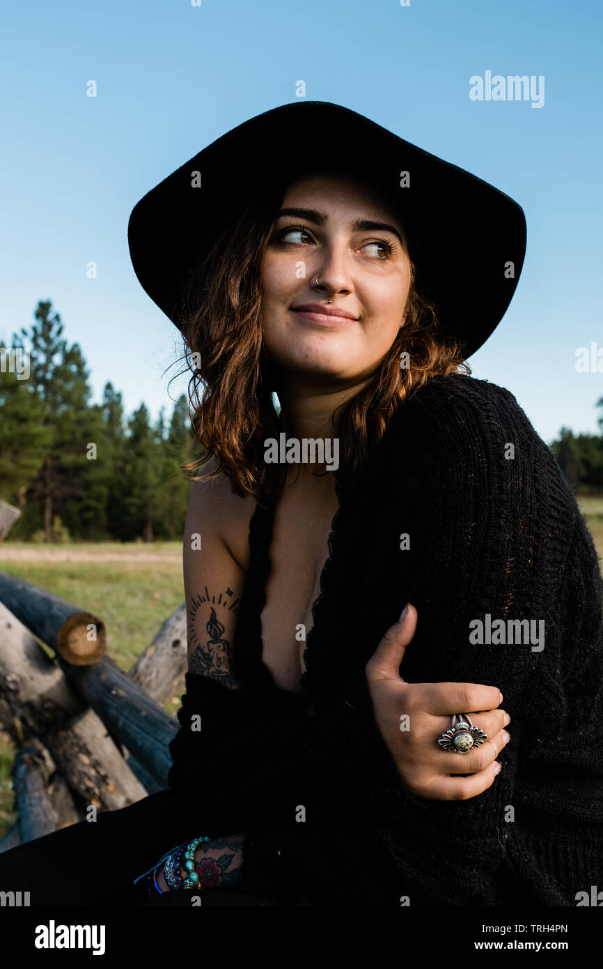 Mujer Hippie Moderno En La Naturaleza Con Ropa Vintage Y Estilo Retro Fotografia De Stock Alamy