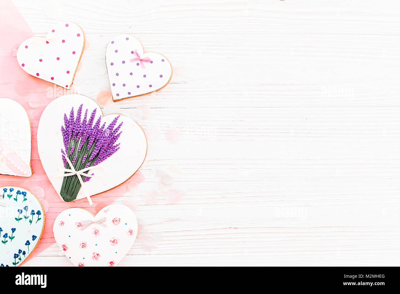 Feliz Dia De La Madre Tarjeta De Felicitacion Cookie Corazones Con Flores De Lavanda En Blanco Con Fondo De Madera Rustica Confetti Espacio Para El Texto Happy Valentine Fotografia De Stock
